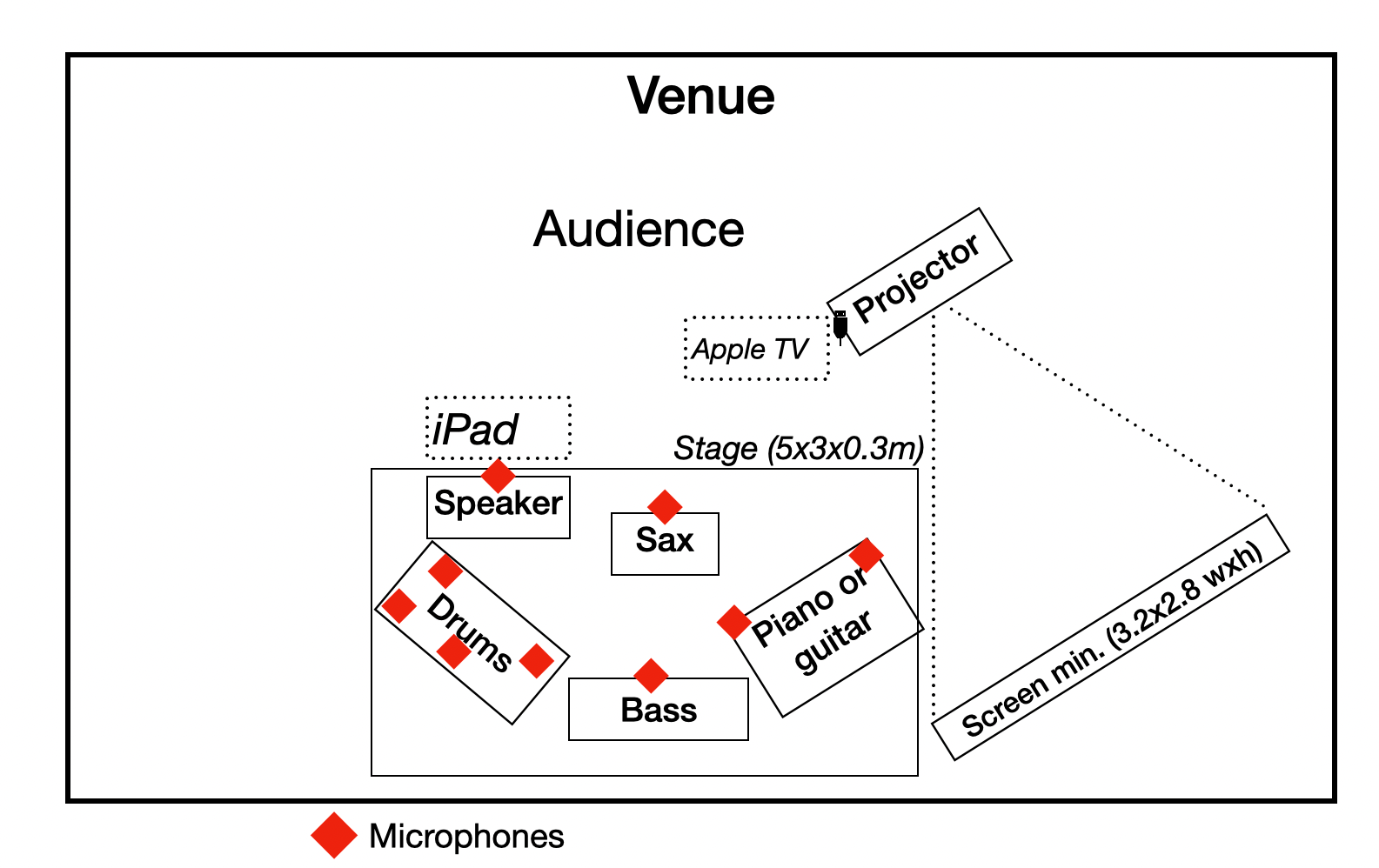 Scenen må være stor nok til å passe til både fire musikere. (For publikum over 35 personer, bør en scene, min. størrelse 5m x3m x 0.3m (B x D x H) være tilgjengelig).
